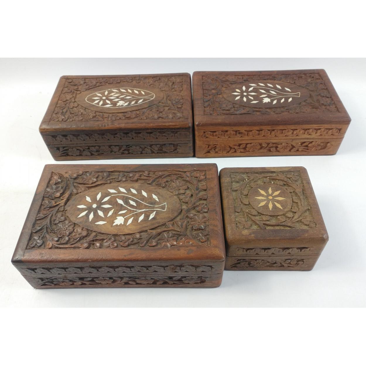 A collection of four hand-carved lidded trinket or jewellery boxes with carved floral design and inlay floral design - 3 larger boxes dimensions 20cm x 12cm x height 7cm and a smaller square one dimensions 10cm square x 67cm height approx