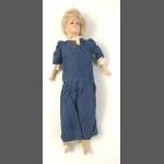 A small vintage composite doll 38cm high approx with soft body and hard limbs and face. Particularly nicely done legs with Edwardian style boots and a very pleasant pretty face with real hair. Slight damage to nose, clothing may be original. A lovely little doll. Indistinct mark to neck piece.