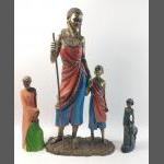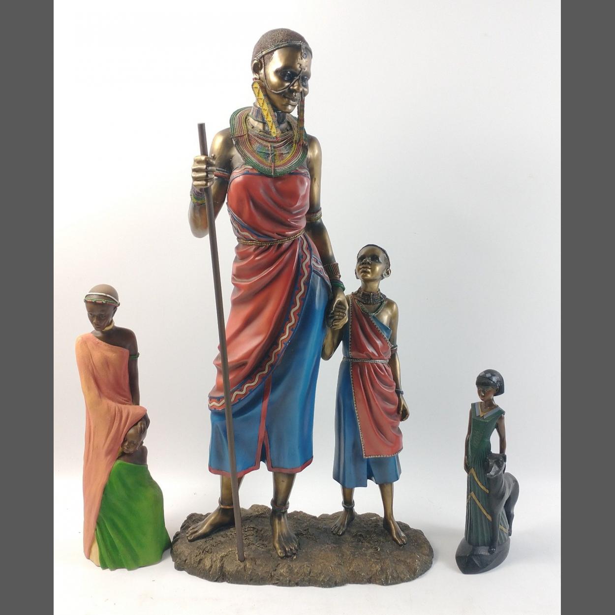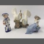 From the LEONARDO collection a figurine of Thai Dancers approx 22cm tall, a LEONARDO Feeding Time group, a Regency Fine Arts Thirsty Work figure approx 17cm high a porcelain decorated mantel clock approx 16cm high and a LEONARDO Classic 'A Stitch in Time' (box damaged)