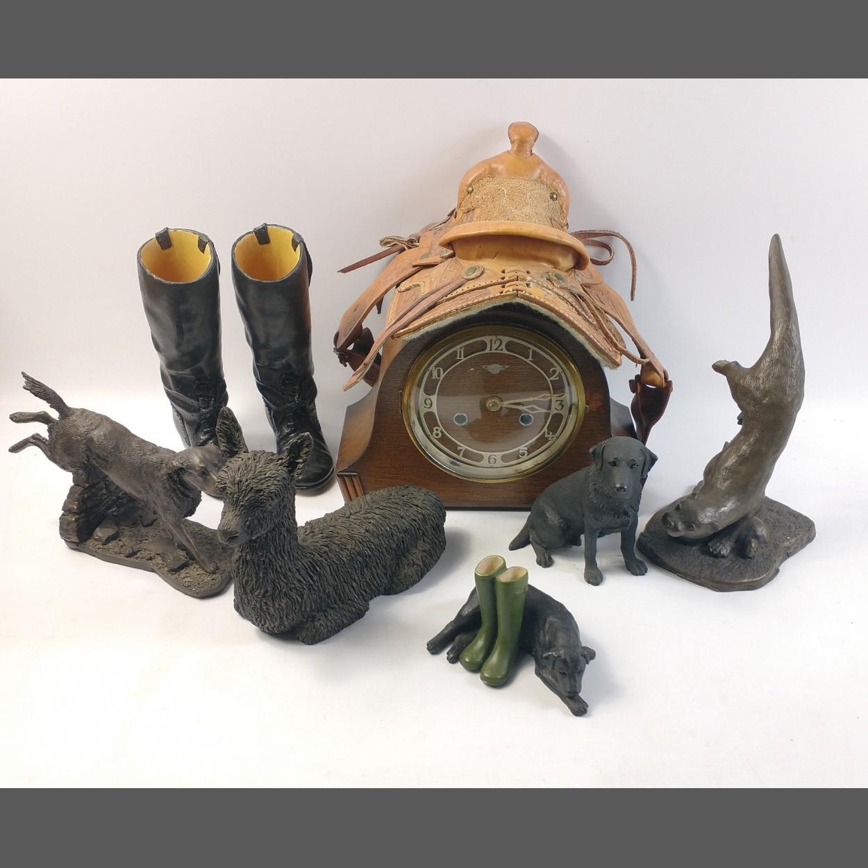 A collection of decorative items to include a wooden mantle clock and various collectible models. BORDER FINE ARTS (DG32a) Labrador. An Oriel diving bronze Otter and others including a small leather decorative saddle.