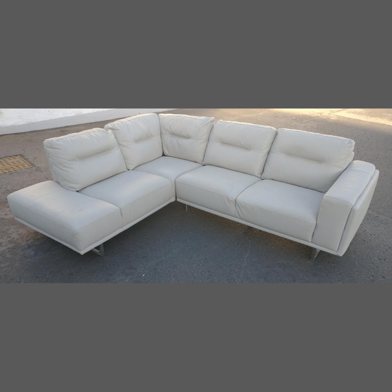 A rather lovely contemporary L shaped two piece sofa ensemble in cream hide/leather. Would benefit from a gentle clean but in good condition with no rips, tears or heavy wear. 270cm along the longest side approx. This sofa is two years old approx and cost £2500 new!