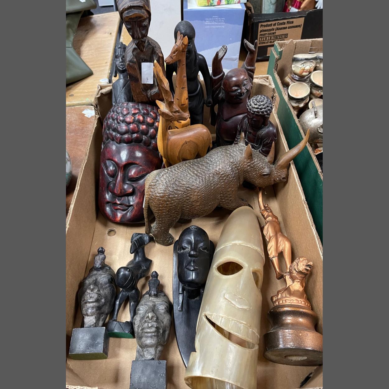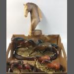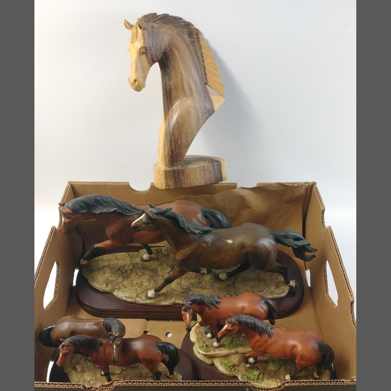 A box containing three LEONARDO COLLECTION equestrian models and a carved wooden horses head from Bali. Three largest model has a small patch of scratching on the rear horse otherwise condition of all pieces is excellent. A very nice little collection.