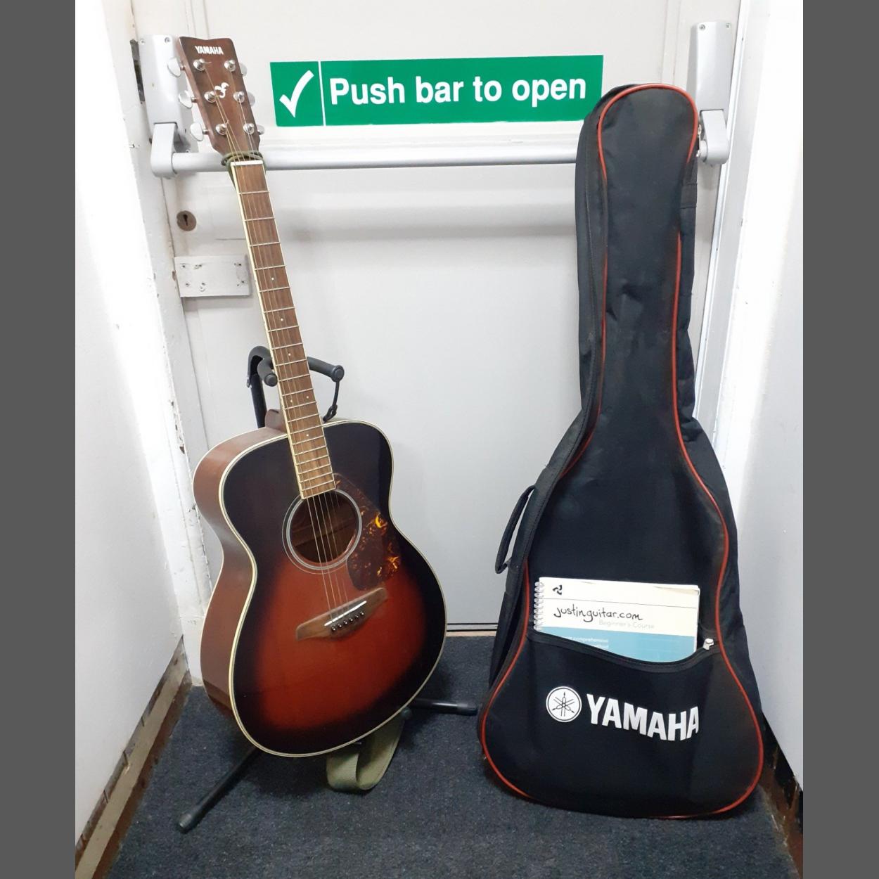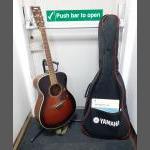 A YAMAHA FS720 acoustic guitar in a soft case and supplied with a guitar stand and two guitar tutorial books. Even includes a pack of spare strings. Lovely condition with Sitka Spruce top and mother of pearl inlays. A well cared for instrument.
