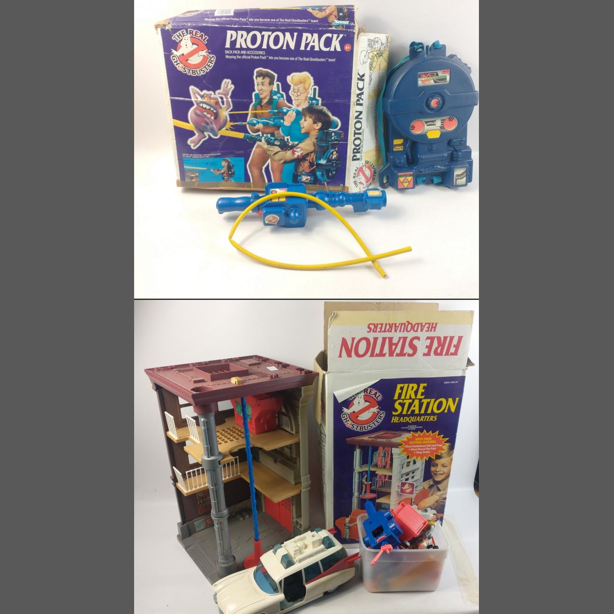 A vintage Kenner REAL GHOSTBUSTERS fire station headquarters with ambulance with some figures, original box with some damage plus a PROTON backpack