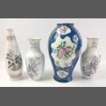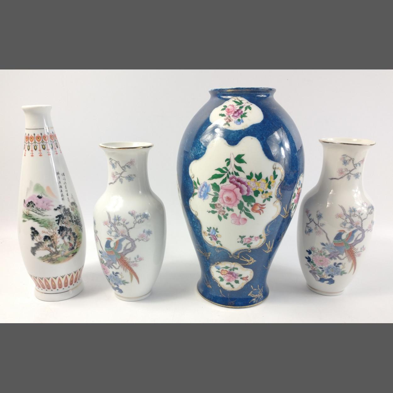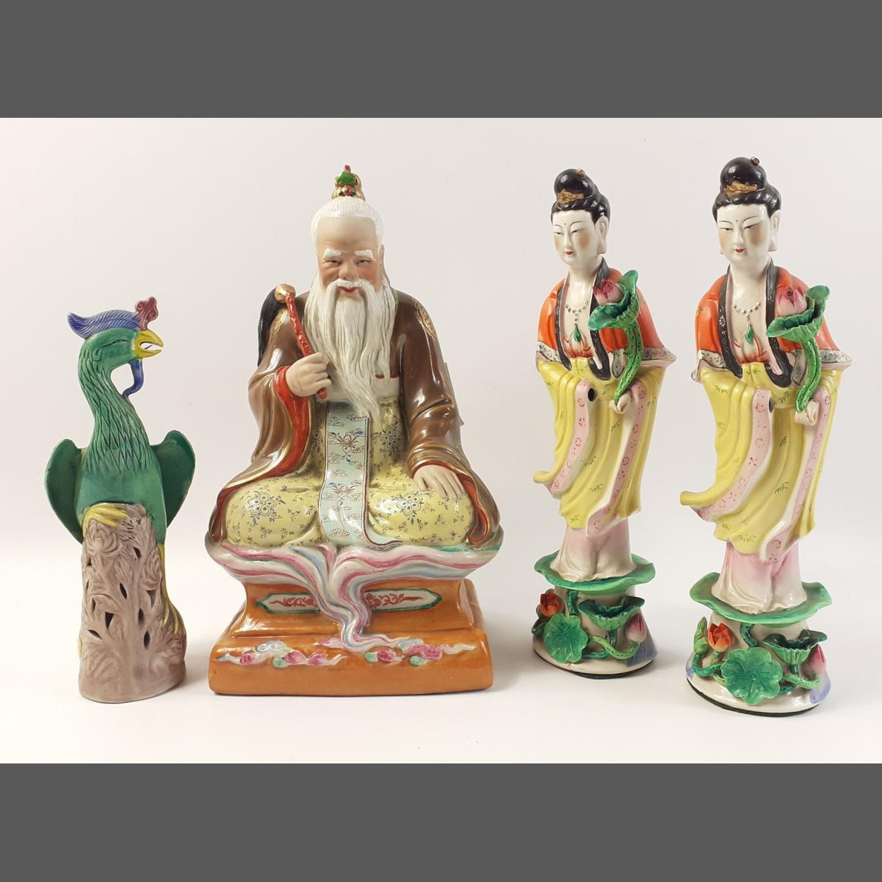 Two ORIENTAL figures to include a porcelaine sitting SHOU LAO and two traditional female GUAN YIN figurines holding a lotus flower - dimensions 26cm height x 7cm width approx with a hand-painted Chinese Phoenix bird medium sized -dimensions 20cm x 5.5cm wise approx