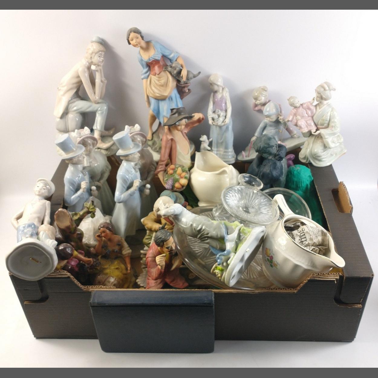 A box of ceramic ornaments to include two very large CAPODIMONTE figures