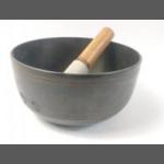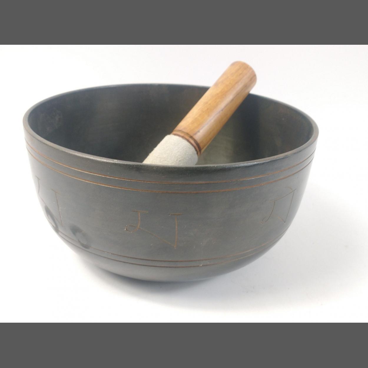 A Tibetan singing bowl with wooden striker with a suede wrap, diameter of bowl 20cm