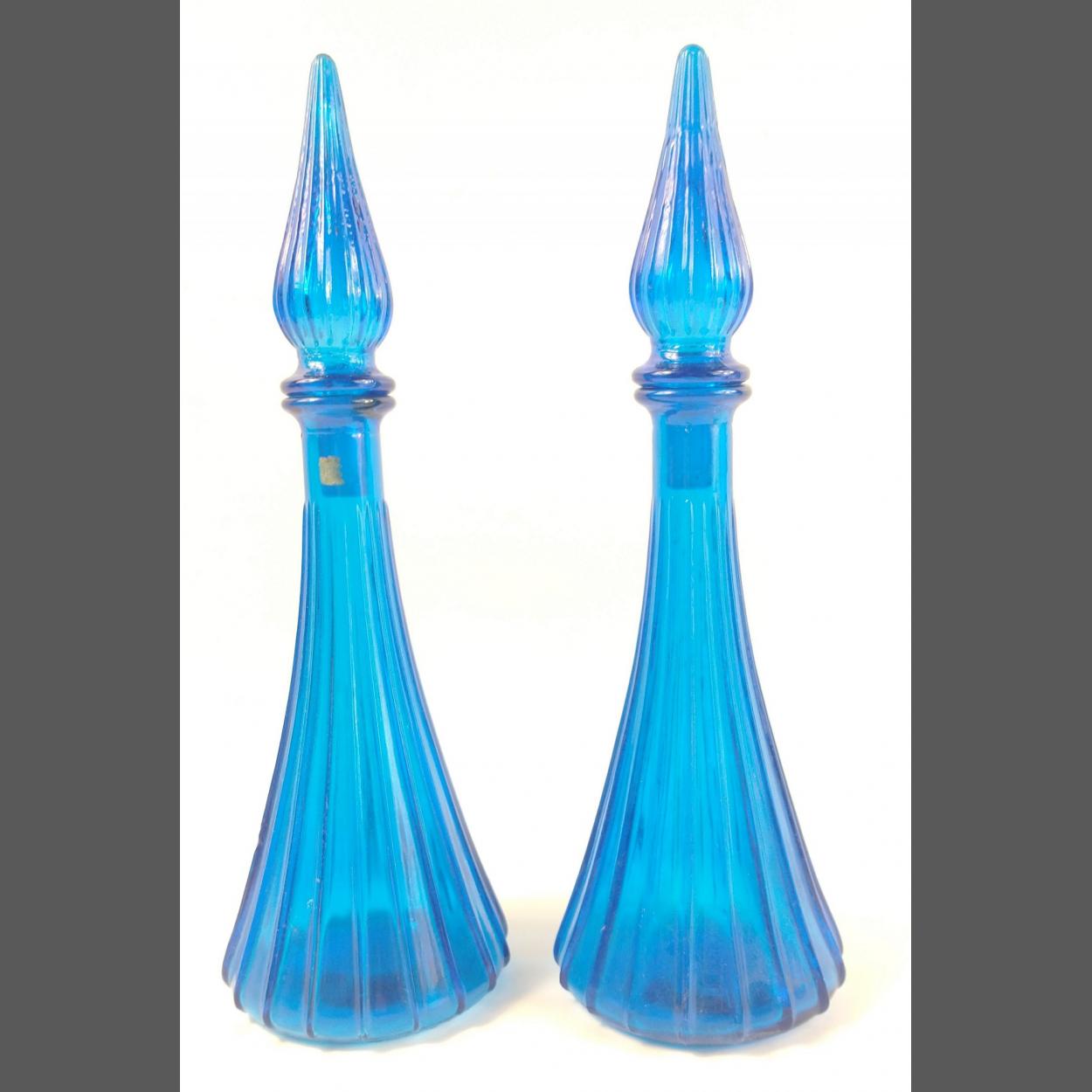 TWO UNUSUAL BEAUTIFUL BLUE lidded APOTHECARY Style glass bottles in perfect condition - dimension 29cm tall approx