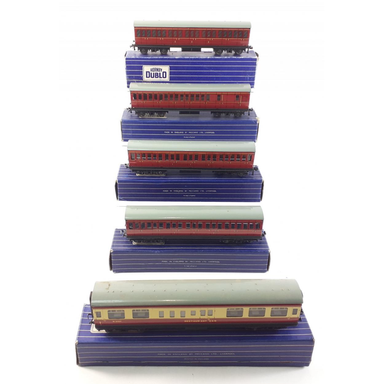 HORNBY DUBLO Rolling Stock. Six boxed Coaches comprising 3 x D12 Corridor Coaches, 1 x D20 Restaurant Car and 2 x D21 corridor Coaches. All have been run as part of a layout.