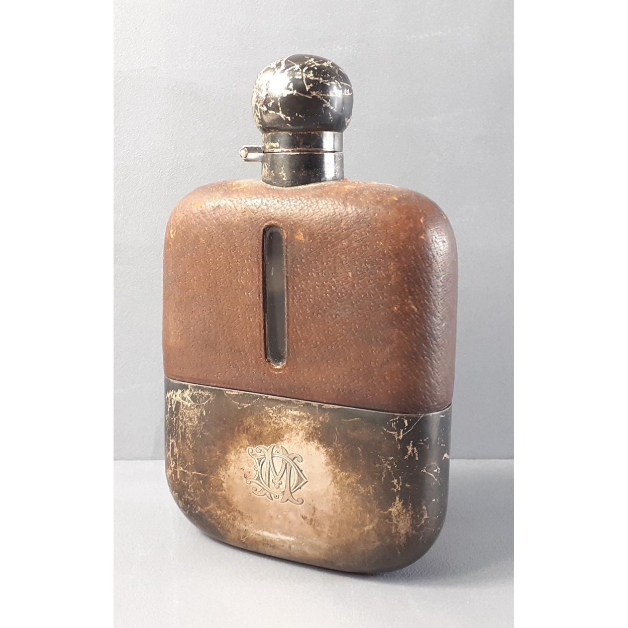A sterling silver bodied hip flask. Hallmarks for Sheffield 1924 made by James Dixon & Sons Ltd. Leather body in good condition, twist lock cap with cork insert. Monogram to silver on rear. Would benefit from a clean.