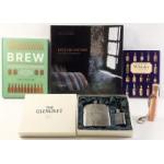 A presentation box with THE GLENLIVET hip flask and keyring nip size flask, a COPPER DOG flask with cork stopper in box. Also three books to include BOTTLES HISTORY by Ian Macilwain, THE SINGLE MALT WHISKY COMPANION by Helen Arthur and BREW: The Foolproof Guide to Making World-Class Beer at Home by James Morton. All items in excellent condition.