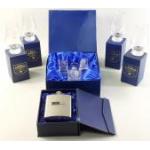 Whisky related glassware boxed comprising BIGGAR Golf Club taster set, four ROYAL LOCHNAGAR whisky tumblers in boxes. Also a hip flask.