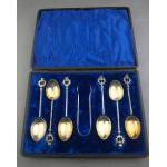 A satin and velvet lined presentation box fitted with 6 hallmarked coffee spoons with thistle finials and an un-matched silver pair of tongs. Spoons hallmarked Birmingham, maker's mark 'WD', weight 61g approx. Damage to box