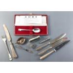 A silver hallmarked lot to include 4 knives, 2 needle cases, fork, butter knife and a lovely wee silver box 25 x 18 x 12mm. Weight 280g approx