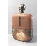 A sterling silver bodied hip flask. Hallmarks for Sheffield 1924 made by James Dixon & Sons Ltd. Leather body in good condition, twist lock cap with cork insert. Monogram to silver on rear. Would benefit from a clean.