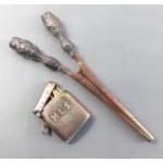 Silver hallmarked Vesta case and silver handled glove stretchers. Both A/F.