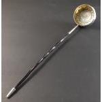 An exquisite Victorian TODDY LADLE with inset coin. Hallmarked Sheffield 1883, makers Richard Martin & Ebenezer Hall. Repousse and chased swags and bow to bowl with acanthus leaf decoration. Possibly with a baleen turned handle. The coin is a late Victorian copy of a Ferdinand III Thaler. Length 35cm. Gross weight 95g approx. A truly lovely piece.
