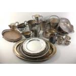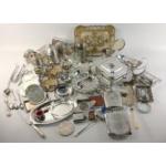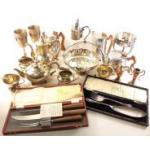 A good quantity of mixed silver plated items and cutlery to include much useful knives, forks, spoons, Picquot ware teapot, condiments etc. And also a lovely large silver plate presentation salver from 1930.