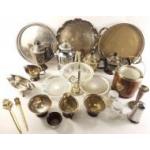 A mixed metal ware lot to include trays, teapots, cutlery and much else.