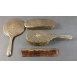 Dressing Table part set with attractive design. Comprising mirror, two brushes and a comb. Plated items with JB Maker mark