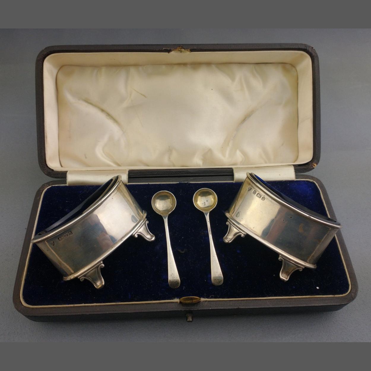 A velvet lined presentation box with 2 silver hallmarked condiment dishes with Bristol blue glass liners and spoons. Hallmarked Birmingham 1900. Weight (w/o liners) 76g approx