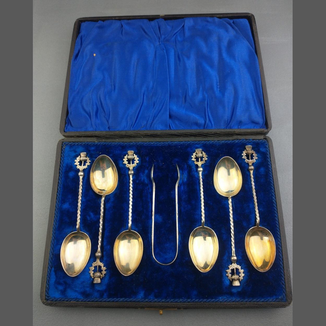 A satin and velvet lined presentation box fitted with 6 hallmarked coffee spoons with thistle finials and an un-matched silver pair of tongs. Spoons hallmarked Birmingham, maker's mark 'WD', weight 61g approx. Damage to box