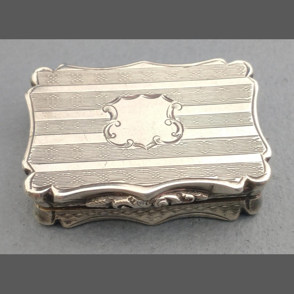 A beautiful silver vinaigrette with Birmingham hallmark and blank cartouche, in excellent condition made by NATHANIEL MILLS, measures 35 x 30 x 15mm, weight 18g approx