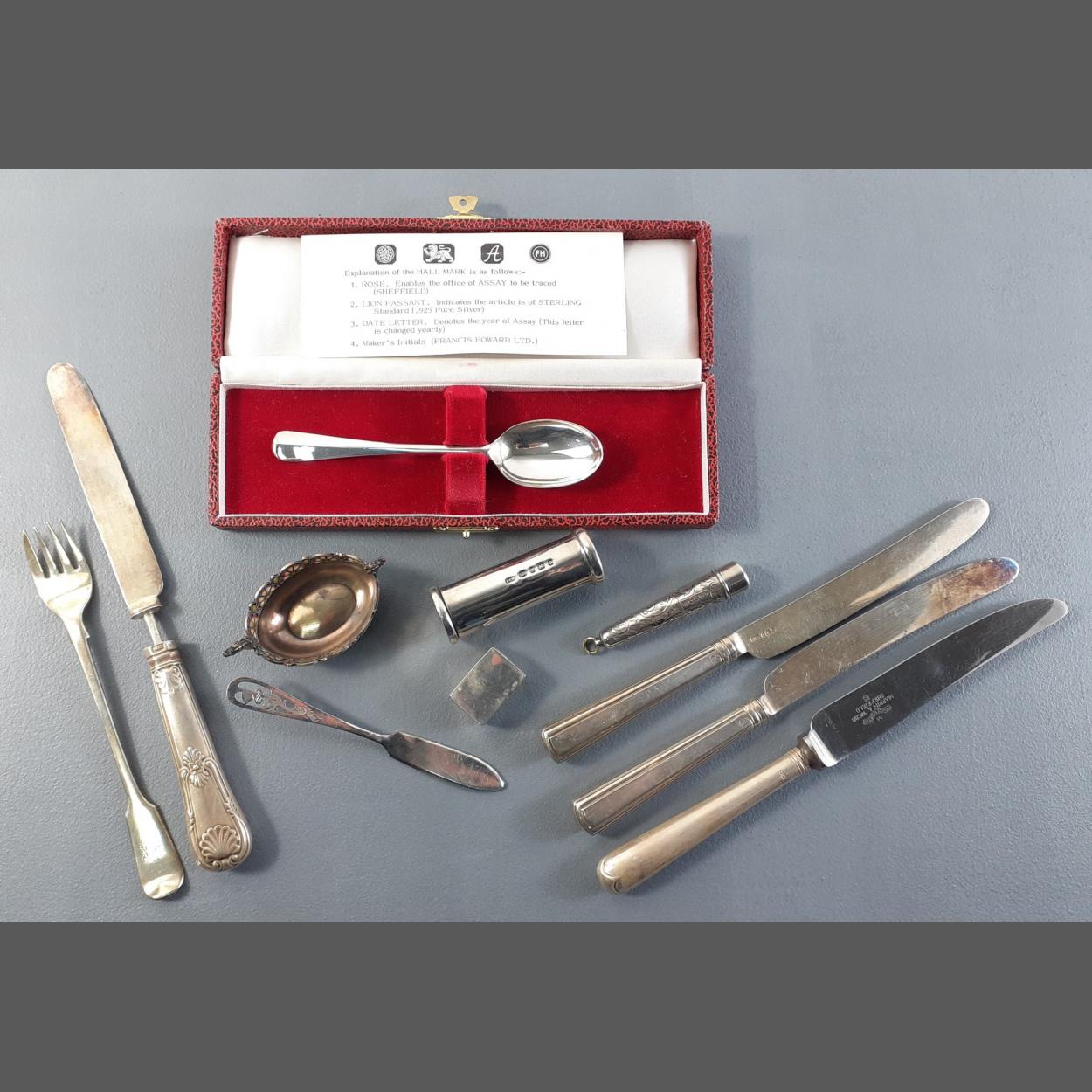 A silver hallmarked lot to include 4 knives, 2 needle cases, fork, butter knife and a lovely wee silver box 25 x 18 x 12mm. Weight 280g approx