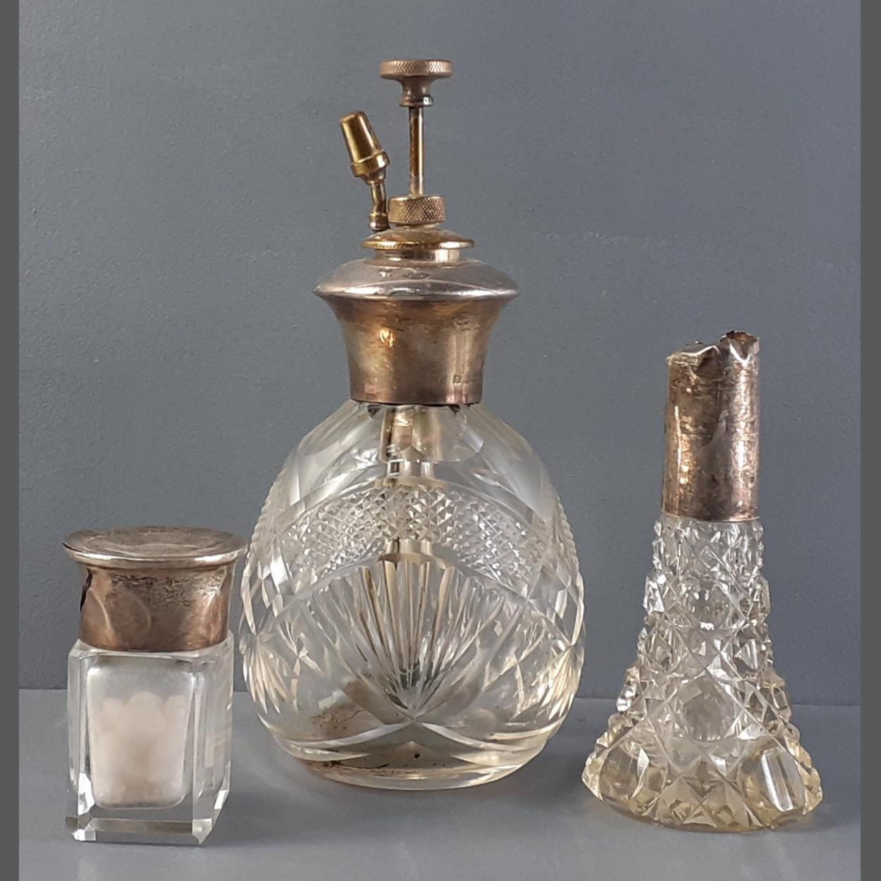 A silver collared scent atomiser (indistinct Birmingham stamps) and two other small bottles A/F.