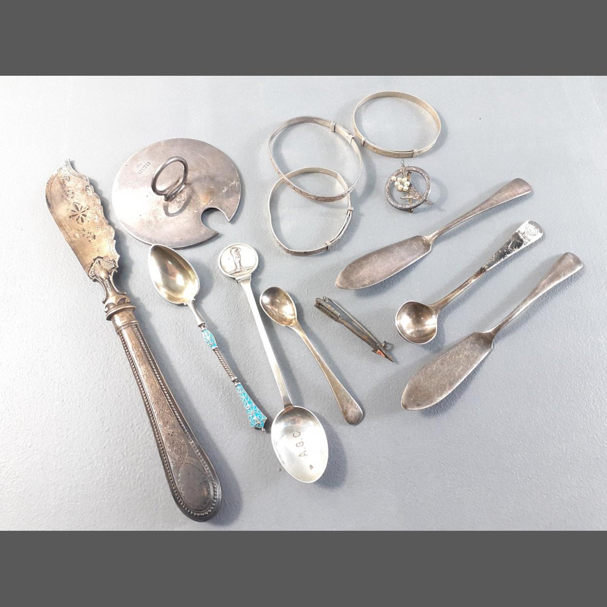 Small lot of silver hallmarked or stamped items to include silver lid, bangles, condiment spoons knife etc. Total gross weight 152g approx.