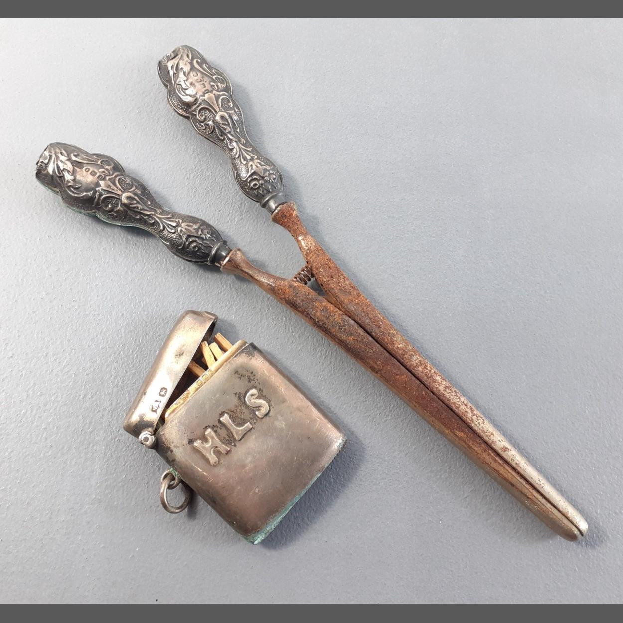 Silver hallmarked Vesta case and silver handled glove stretchers. Both A/F.