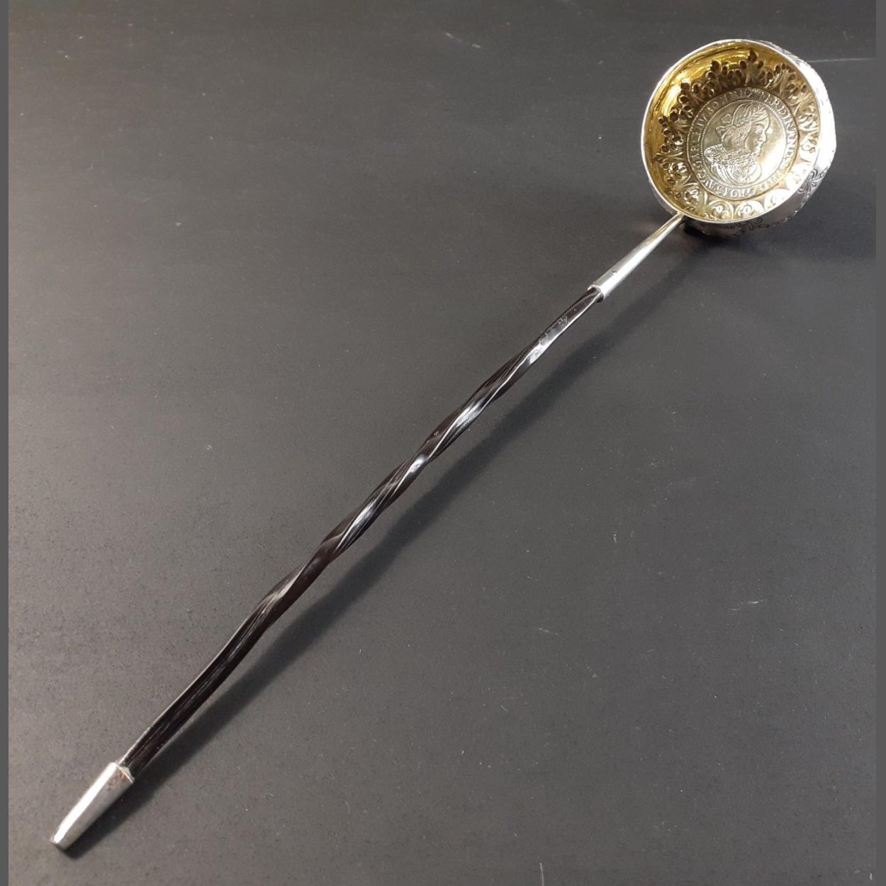 An exquisite Victorian TODDY LADLE with inset coin. Hallmarked Sheffield 1883, makers Richard Martin & Ebenezer Hall. Repousse and chased swags and bow to bowl with acanthus leaf decoration. Possibly with a baleen turned handle. The coin is a late Victorian copy of a Ferdinand III Thaler. Length 35cm. Gross weight 95g approx. A truly lovely piece.