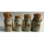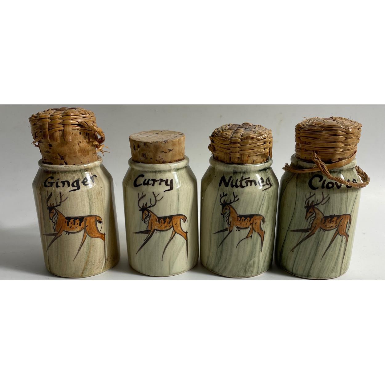 VINTAGE & UNUSUAL! Four oynx effect china kitchen storage jars 'Curry', 'Nutmeg', 'Cloves' and 'Ginger' with deer motif. All with cork stoppers, 1 missing woven covering