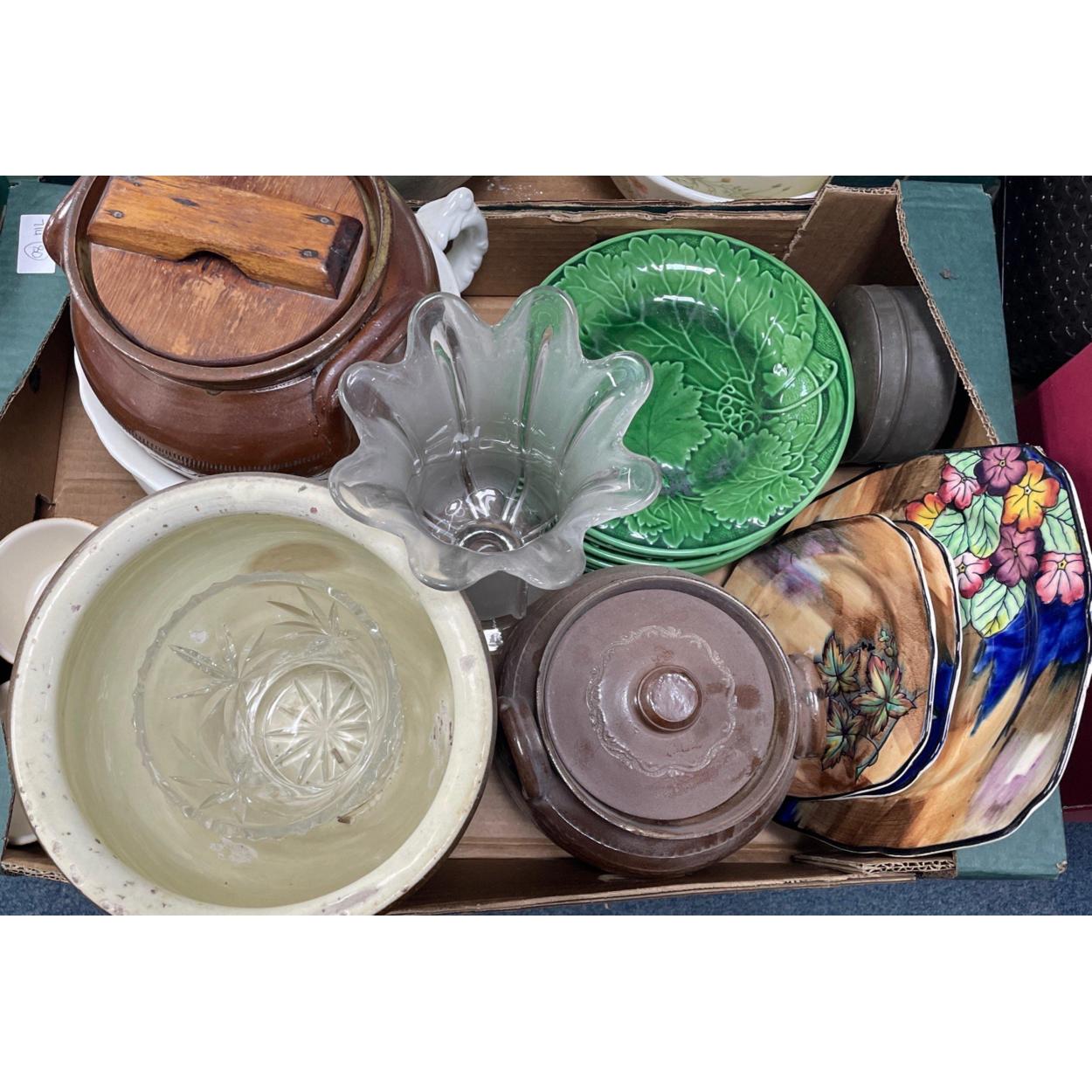 A mixed lot to include some STONEWARE lidded dishes, PYREX OVEN TO TABLEWARE, and six vintage cabbage leaf side plates and much much more!