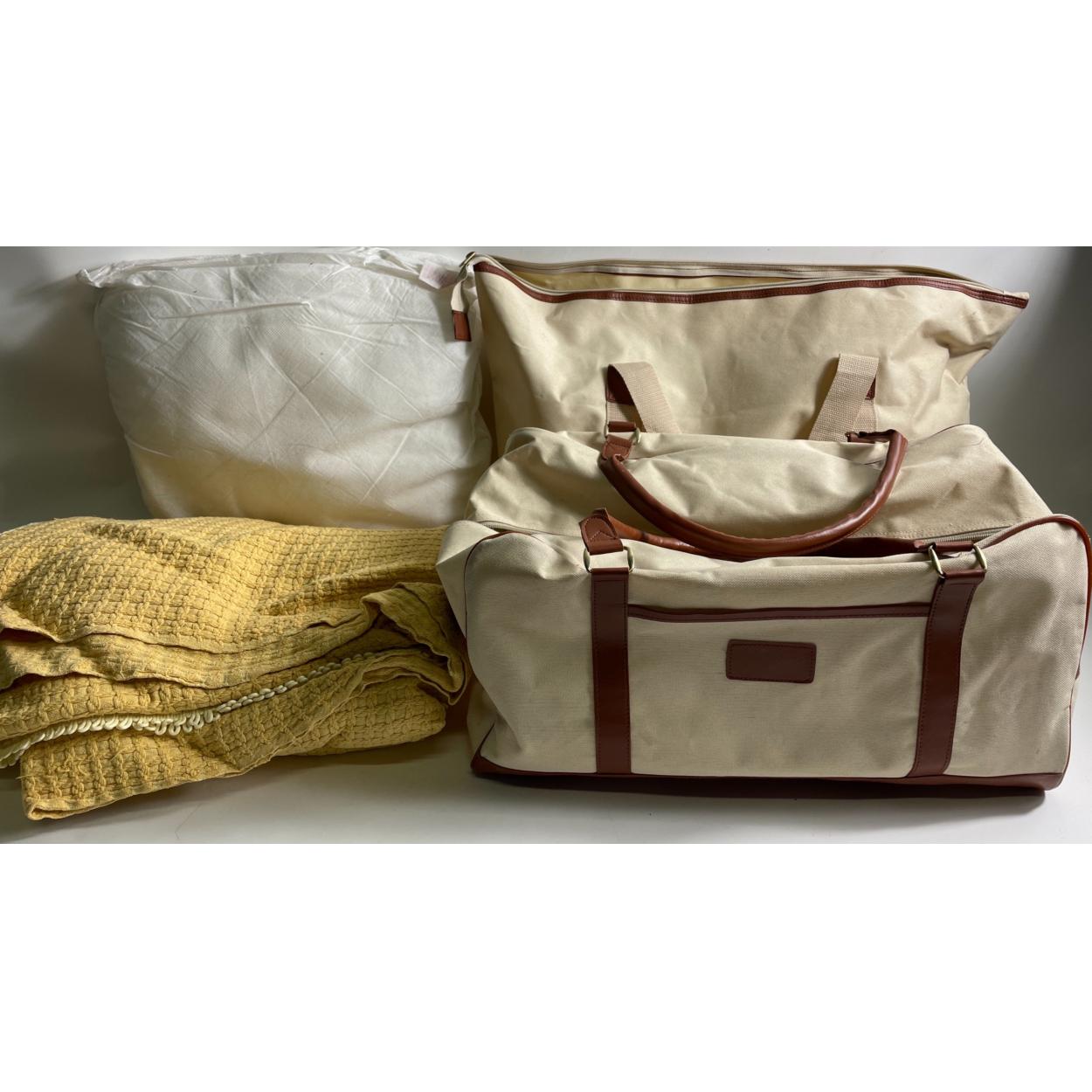 Two piece cream canvas with brown trim WEEKEND LUGGAGE SET with contents.