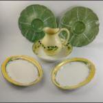 A ceramics lot to include 2 large Portuguese cabbage hors d'oeuvres plates (33cm dia approx) plus a large salad bowl with pattern of olives with matching jug and 2 oval (30cm) FALART platters with a daffodil pattern