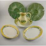 A ceramics lot to include 2 large Portuguese cabbage hors d'oeuvres plates (33cm dia approx) plus a large salad bowl with pattern of olives with matching jug and 2 oval (30cm) FALART platters with a daffodil pattern