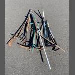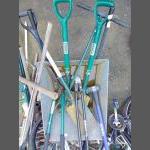 A bundle of garden tools to include pick axes, garden rake, edging shears, garden fork and a parasol as new!...