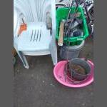 A HANDY OUTDOOR MIX! - A galvanised coal bucket, a pink plastic tub, a metal planter with handle and a box full of solar garden lanterns etc