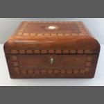 An exceptionally attractive desk top stationery or storage box with beautiful inlay finish. Fully working lock with key. Measures 30cm x 14cm x 21cm approx. In very good useable condition with no missing inlay.