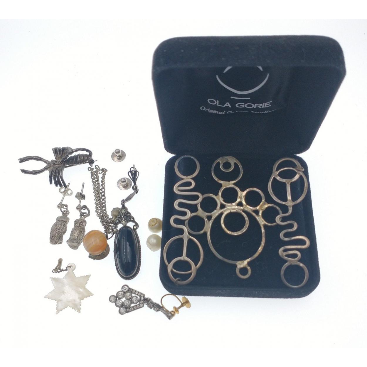 A mixture of some jewellery items to include a scorpion pin brooch, a set of owl earrings and a set of 'white metal' unmarked stylised earring and pendant set