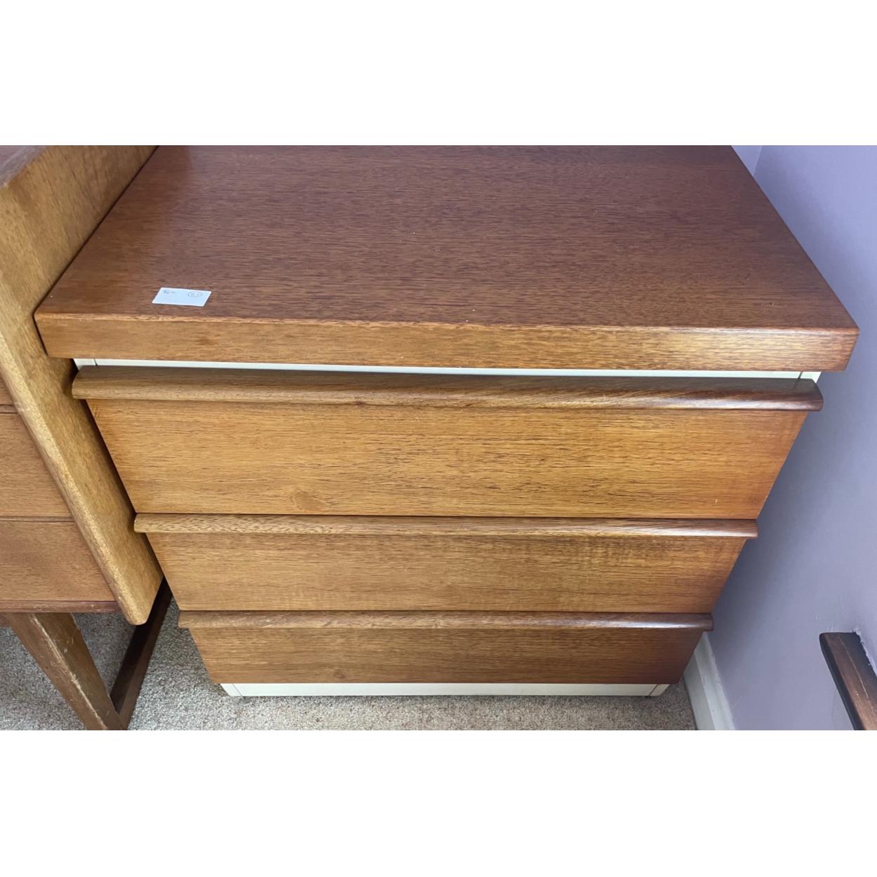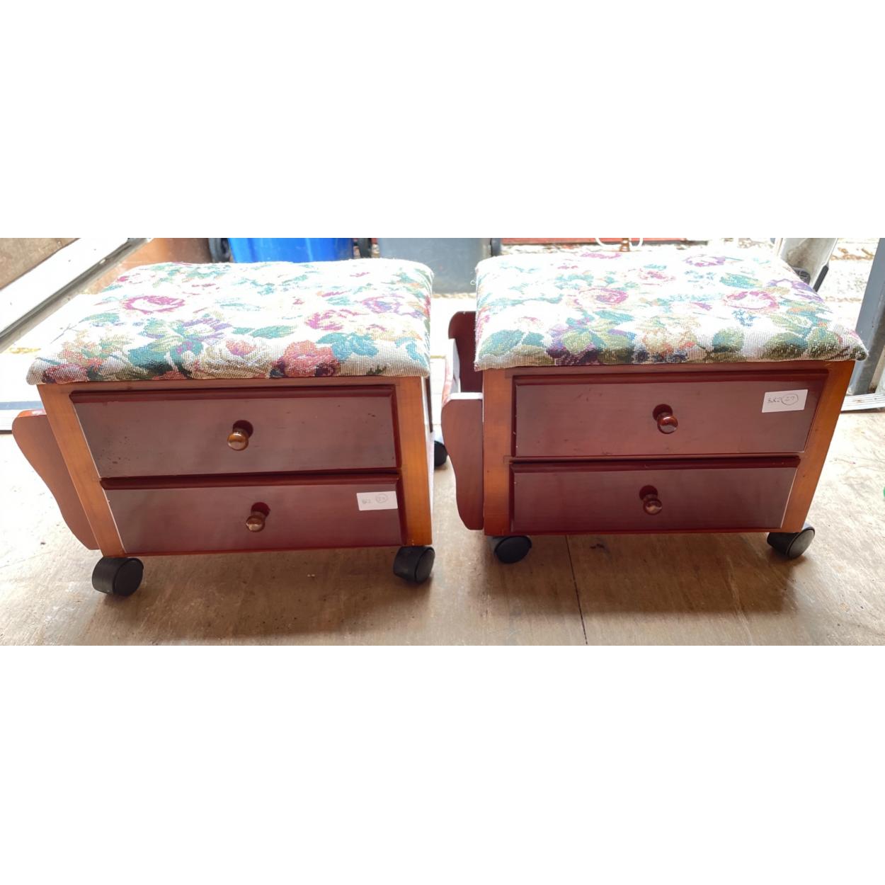 A pair of mobile footstools with two storage drawers and a small magazine rack on one side dimensions each are 38cm length x 26cm width x 26cm height / both on castors