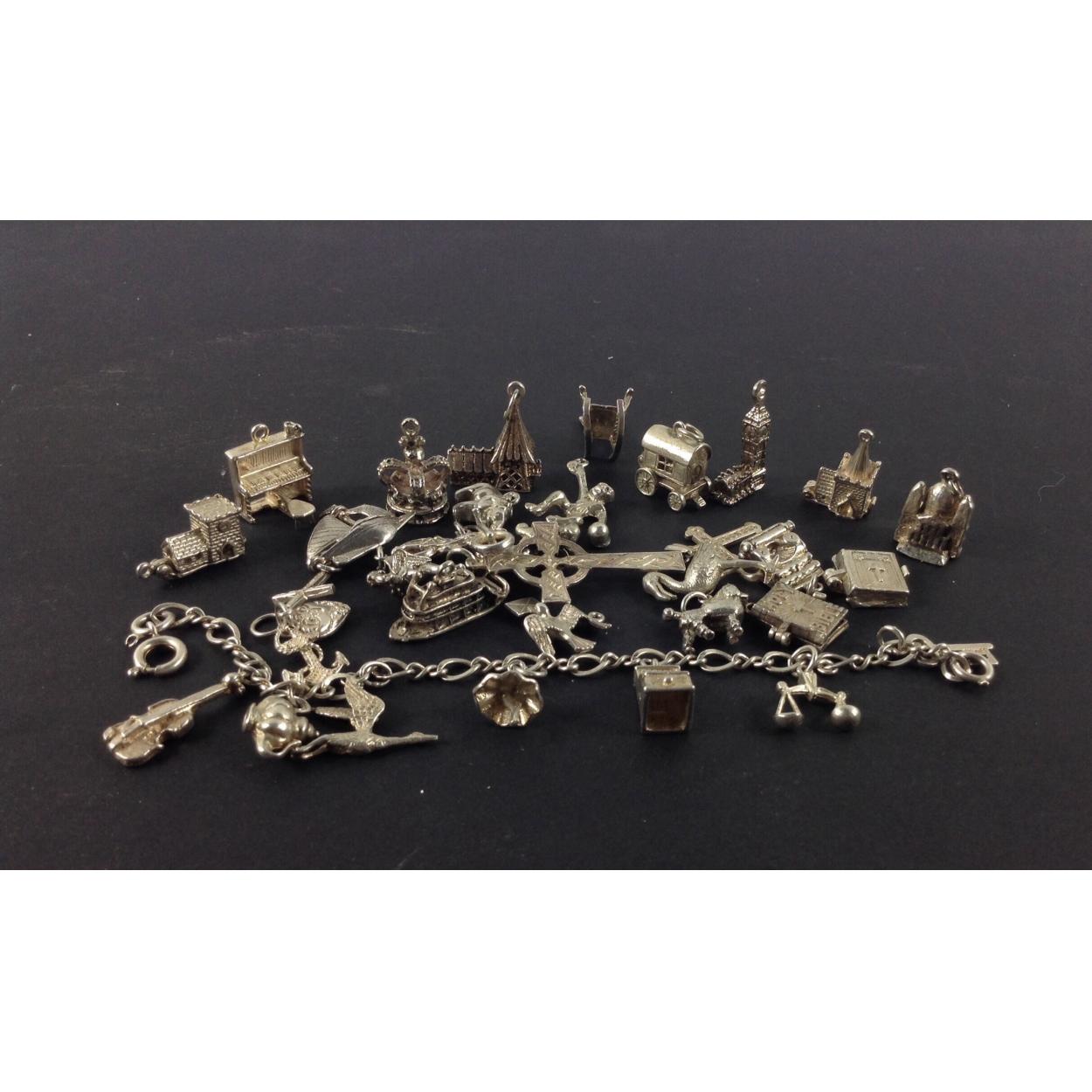 A white metal charm bracelet approx 16.5cm with 7 charms plus a further 27 charms includes 3 charms stamped silver with approx gross weight of 7g