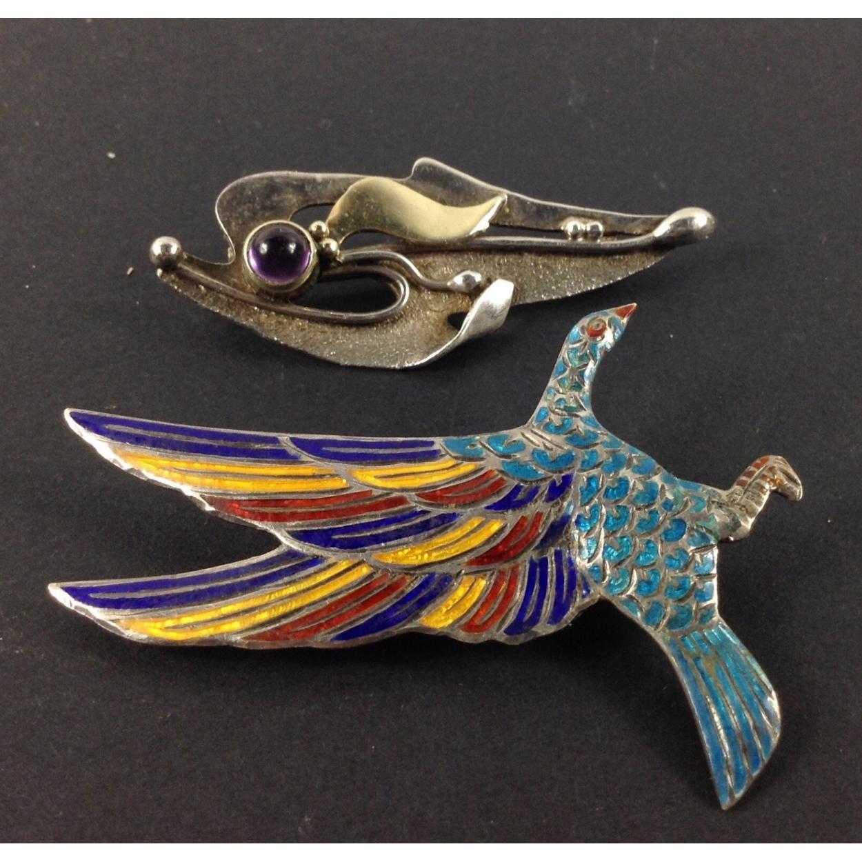 A VINTAGE brooch stamped 925 with a purple stone 5cm long, gross weight 6g, and a Thai silver enamelled phoenix brooch 6cm long, gross weight 8g approx