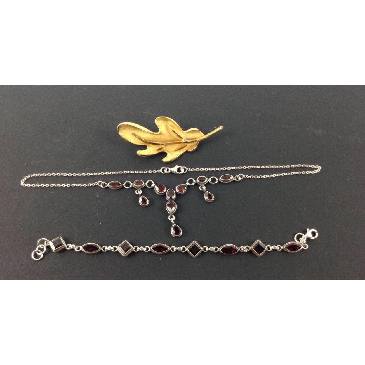 A silver necklace and bracelet stamped 925 with red stones, bracelet approx 18cm long, necklace approx 40cm long gross weight 25g approx plus 1 other leaf-shaped brooch