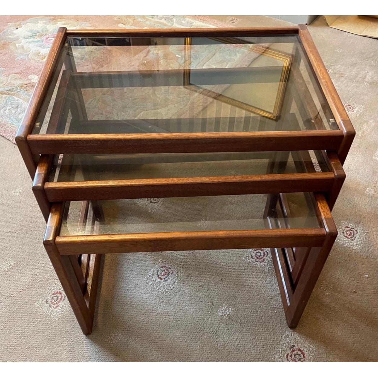 A set of four tables in teak dimensions length 62cm x 42cm depth x 57cm height