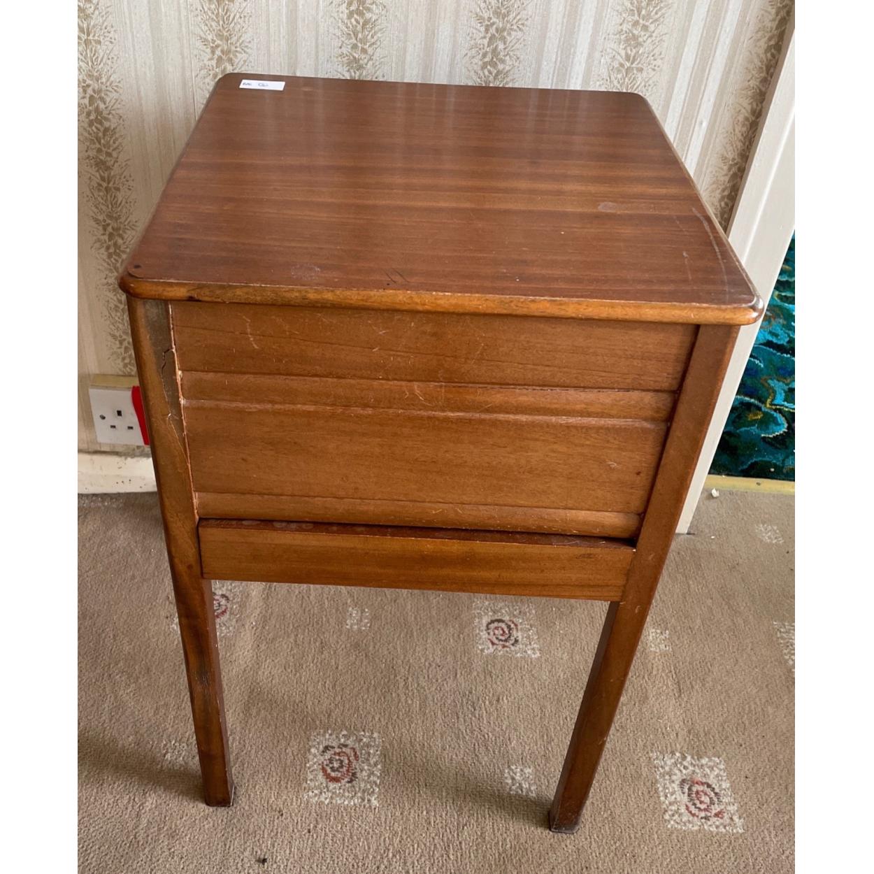A RETRO teak lidded SEWING work-table for storage etc and a small bottom drawer dimensions top 40cm square x 60cm height