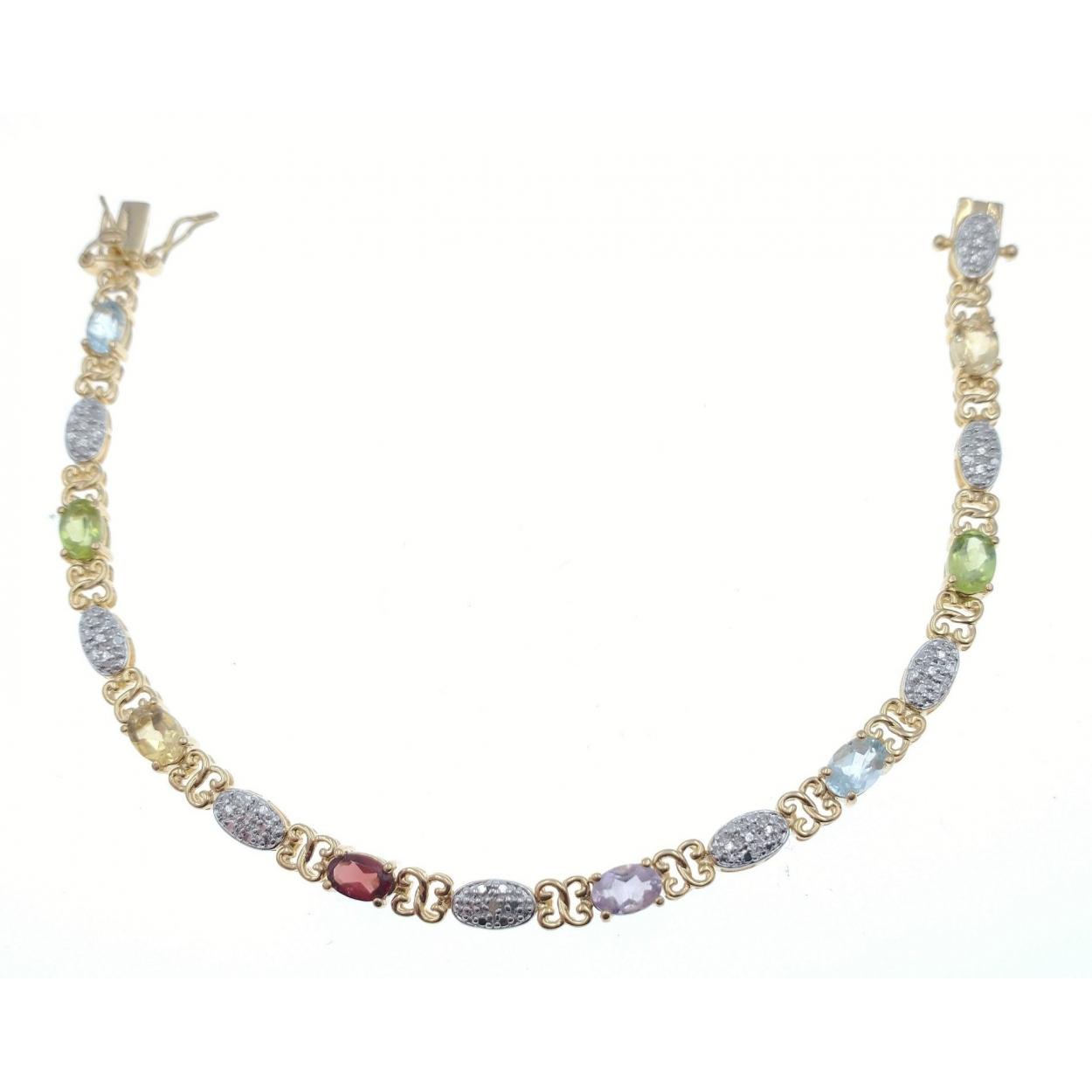 Yellow metal bracelet stamped 18 and 925 (18kt gold plated over 925 silver) set with various colour stones, spaced with very small diamonds (tested) with a double scroll pattern joining the sections together.