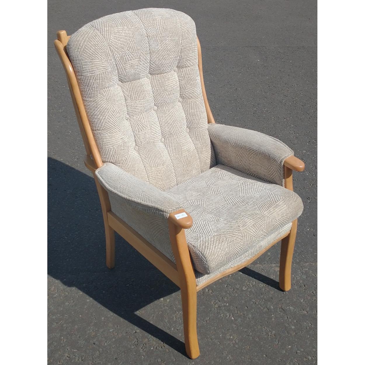 A QUALITY wooden framed high-backed easy armchair in an oatmeal coloured fabric