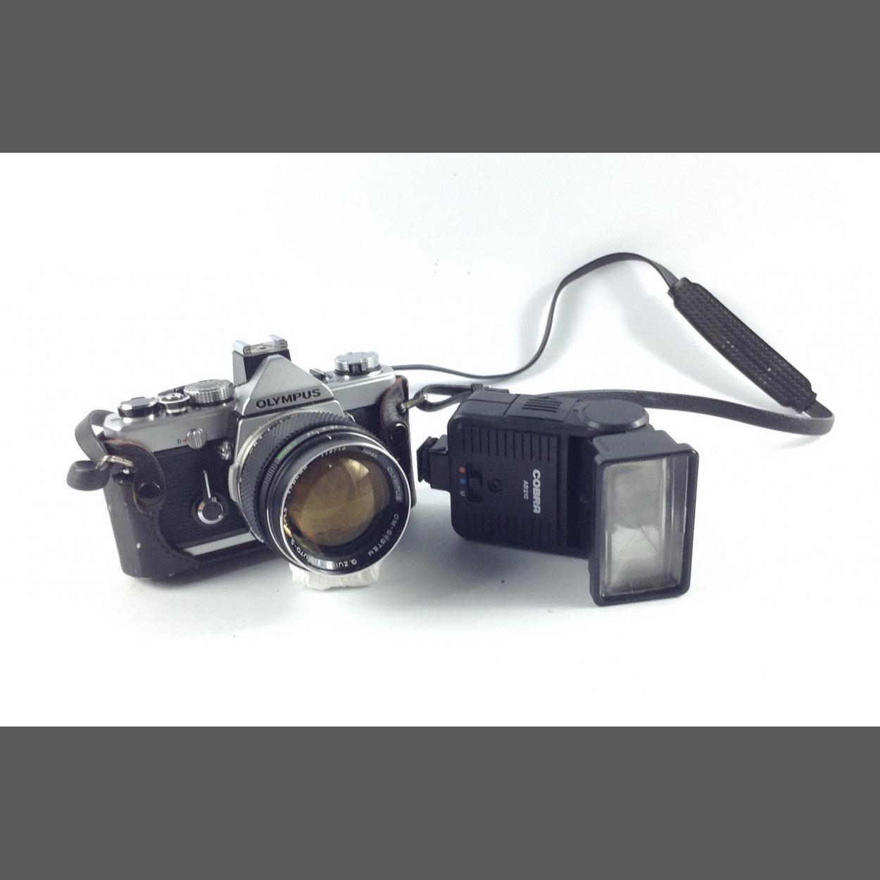 An OLYMPUS OM-1N 35mm SLR Film Camera with 55mm OM-system G. Zuiko auto-s 1:1.2 lens in a worn carrying case plus a COBRA AB210 Electronic photo flash